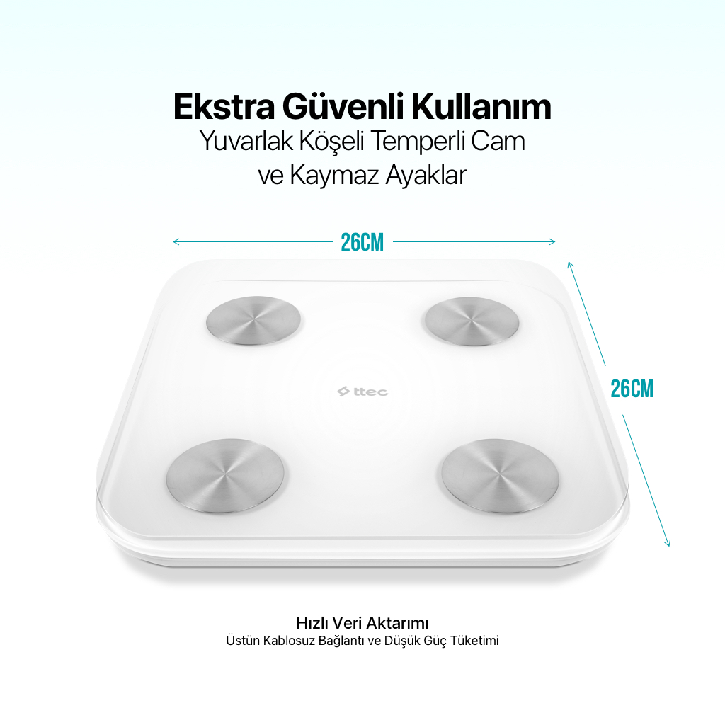 - Yuvarlak köşeli temperli cam tasarım ve kaydırmaz ayaklar ile ekstra güvenli kullanım