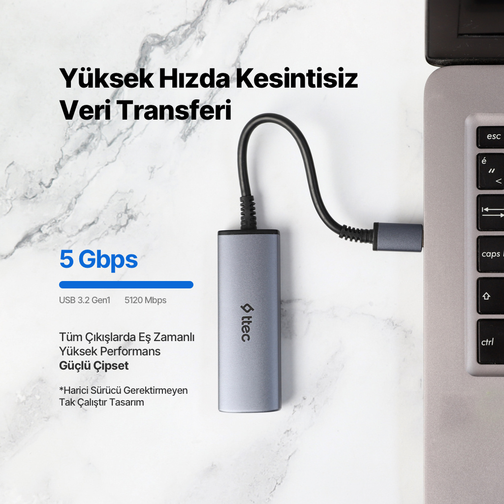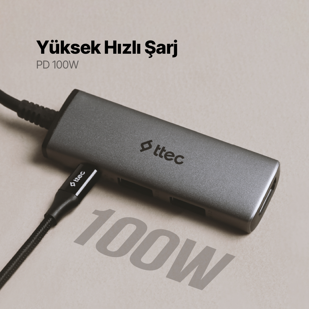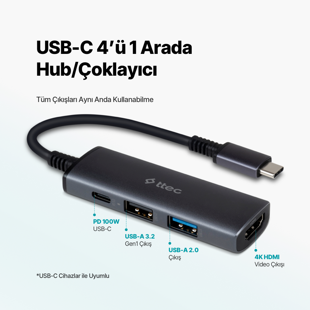 - 4 Port USB-C 3.2 Hub/Çoklayıcı USB-C 100W PD 3.0 + 4K HDMI + USB-A 3.2 + USB-A 2.0 (MacBook Uyumlu)